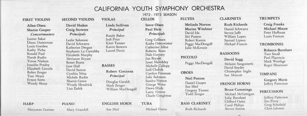 The CYS 21st Season – First Concert, conducted by Aaron Sten, was performed on Sunday, October 29, 1972, at 7:00 P.M. at the San Mateo High School Auditorium, with a repeat concert on Sunday, November 5, 1972, at 2:30 P.M. at the Flint Auditorium.