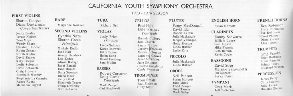 The CYS 22nd Season – First Concert, conducted by Aaron Sten, was performed on Sunday, November 11, 1973, at 7:00 P.M. at the San Mateo High School Auditorium, with a repeat concert on Sunday, November 18, 1973, at 2:30 P.M. at the Flint Auditorium.