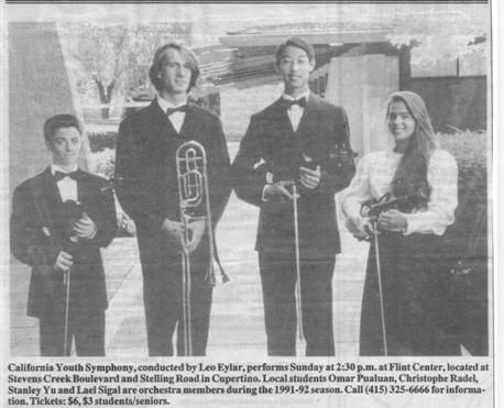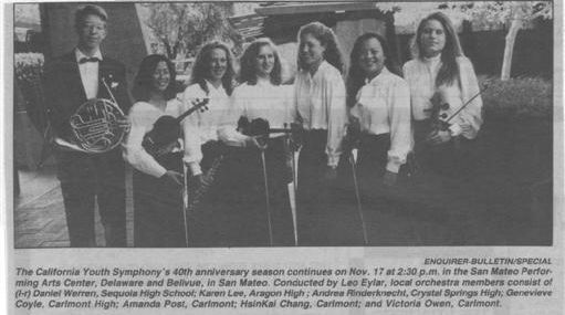 The November concerts received glowing reviews from the Peninsula Times Tribune, The Times, and the San Jose Mercury News. Critics noted that the ensemble’s performance rivaled, and in some cases surpassed, the quality of adult community orchestras in the Bay Area. The Times Tribune praised the "flamboyant, breezy conducting style" of Leo Eylar and the "rich, lush tine" displayed by Lee in the concerto’s melodic passages. Reporters highlighted the "clear, bold" standard set by the horn section and the "formidable" resonance of the Saint-Saëns finale. Beyond the technical critiques, the media coverage captured a sense of community pride, noting that with a near-capacity turnout of 1,450 at the Flint Center alone, the 40th anniversary season was off to an "auspicious start," leaving the Peninsula’s cultural landscape "all the richer for it."