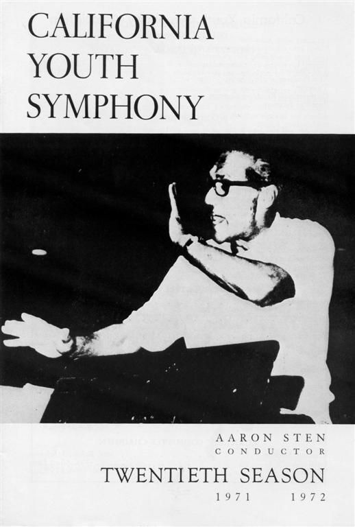 The CYS 20th Season First Concert, conducted by Aaron Sten, was performed twice in November 1971. The first performance was held on Sunday, November 7, 1971, at 7:00 p.m. at San Mateo High School, and the second took place on Sunday, November 14, 1971, at 2:30 p.m. at De Anza College.