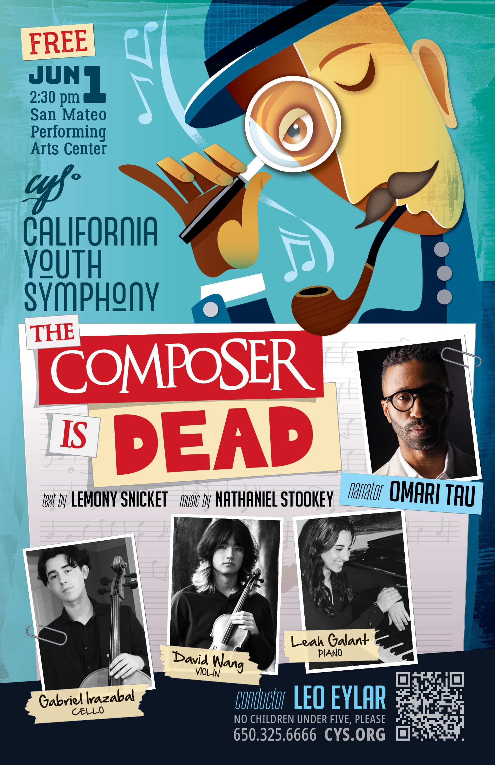 Our season finale is an event you definitely don’t want to miss, as we proudly present two contemporary American classics: Jennifer Higdon’s Blue Cathedral and Nathaniel Stookey’s The Composer Is Dead. Blue Cathedral is one of Jennifer Higdon’s early and most celebrated works for orchestra, and was composed in 1989. The piece has since become a favorite in the American contemporary classical repertoire, appreciated for its evocative, meditative character and lyrical exploration of sound and emotion. Over the years, its expressive narrative has resonated with audiences and performers, contributing significantly to Higdon's reputation as a leading modern composer. The Composer is Dead was commissioned by the San Francisco Symphony in 2006 with text by Lemony Snicket and music by Nathaniel Stookey. The piece premiered on July 8, 2006, and was later released as a book with CD with illustrations by Carson Ellis. The story is a musical murder mystery about the killing of a composer. The plot takes place in an orchestra, and it is the inspector’s mission to interrogate the orchestra's instruments and uncover who killed the composer. We are delighted to welcome back to the CYS stage singer, actor, director, composer, and educator Omari Tau, who will narrate this entertaining and superbly written musical "who-dunnit."